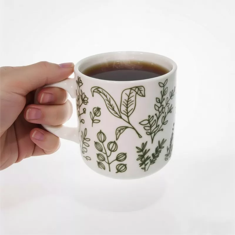 1. Визуальным центральным элементом этой кружки является простой и естественный зеленый ботанический принт: