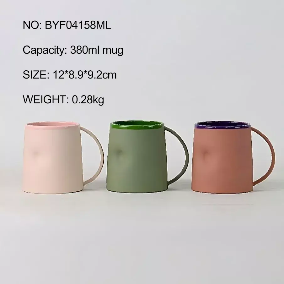 Правильная модель (BYF04158MS) поставляется в трех пастельных оттенках: светло -серый, бежевый и бирюзовый. Он имеет 270 мл, размером 11,5 х 8,7 х 6,7 см и весит 0,19 кг. Обе кружки похожи по высоте, воплощая свежий и элегантный стиль. Левая модель немного больше и удерживает больше, что позволяет клиентам выбирать тот, который наилучшим образом соответствует их потребностям.