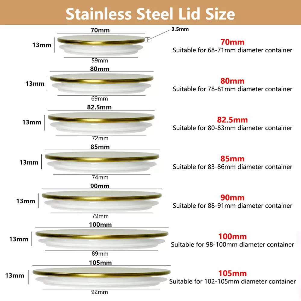 Наша накройная печать от нержавеющей стали крышки для свечей доступны в различных размерах, все с общей высотой 13 мм. Конкретные размеры и совместимые отверстия для контейнеров показаны ниже: